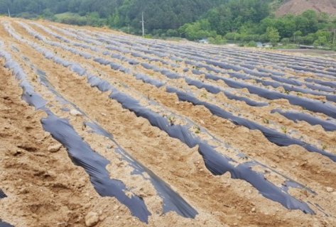고구마는 병충해도 많지 않고 비료가 거의 필요하지 않은 작물이라 밭만들기가 비교적 쉽습니다. 그래서 아주 척박한 땅이 아니라면 밭만 곱게 갈아 만들어두시면 됩니다. 두둑 높이는 20~25cm로, 이랑 너비는 70~75cm로 만들어주세요. 5월 초쯤 비소식을 확인하여 비온 직후 두둑에 비닐 멀칭을 해주어 수분을 가 주는 것이 좋습니다.